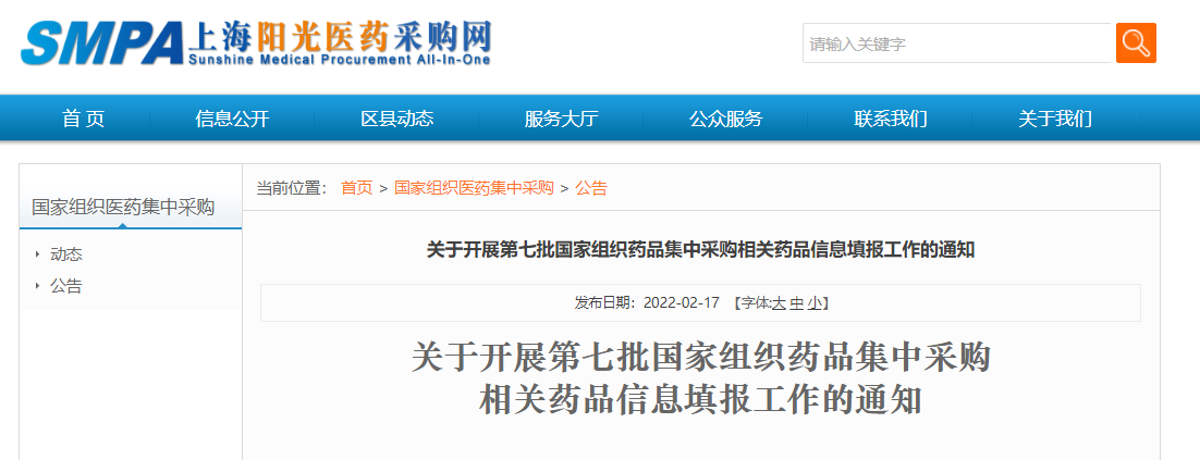 今日,上海阳光药品采购网发布官方通知宣布:自2022年2月18日起,联合采购办公室开展第七批国家组织药品集中采购相关药品信息填报工作。