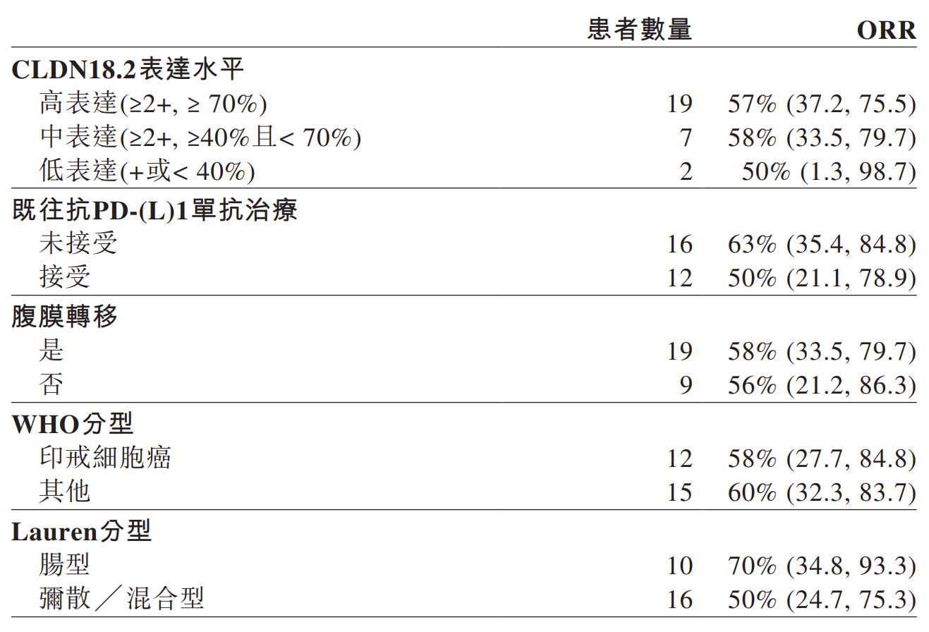 对于28名患有GC/GEJ的患者,亚组分析显示ORR在不同基线特征均可维持在50%或以上,例如,CLDN18.2表达水平和既往抗PD-(L)1单抗治疗。