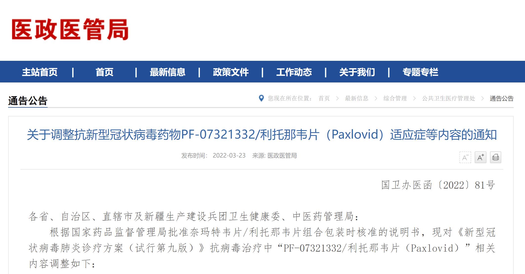 3月23日晚间,国家卫生健康委办公厅、国家中医药管理局办公室联合发布《关于调整抗新型冠状病毒药物PF-07321332/利托那韦片(Paxlovid)适应症等内容的通知》,对《新型冠状病毒肺炎诊疗方案(试行第九版)》抗病毒治疗中“PF-07321332/利托那韦片(Paxlovid)”相关适用说明作出调整,取消青少年(12-17 岁,体重≥40kg)适用人群。