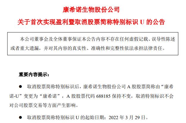 在年报业绩公布的同时,康希诺紧跟着发布了一份公告称,根据相关规定,公司2021年度归属于母公司股东的净利润以及扣除非经常性损益后归属于母公司股东的净利润均为正,符合“上市时未盈利公司首次实现盈利”的情形,公司A股股票简称将于2022年3月29日取消特别标识,由“康希诺-U”变更为“康希诺”, 康希诺也由此成为科创板首个成功“摘U”的生物科技公司。