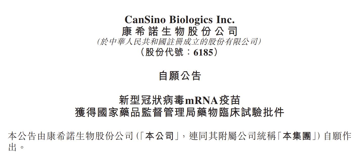 4月4日,同样在港交所上市的康希诺生物发布自愿公告称:本集团开发的新型冠状病毒mRNA疫苗已获得国家药品监督管理局药物临床试验批件。