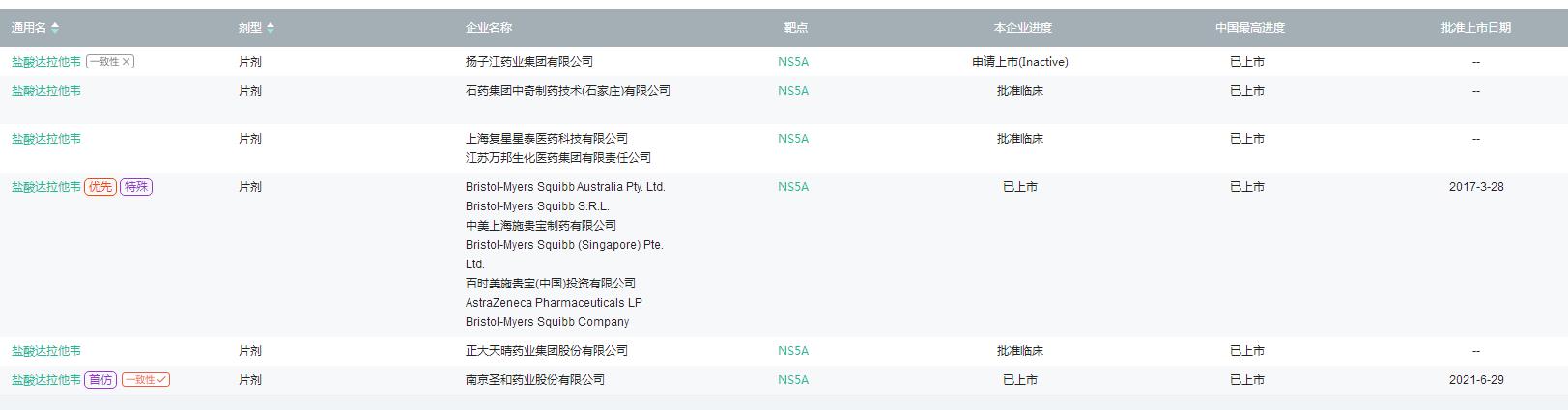 据医药魔方数据库显示,现阶段,包括石药集团、正大天晴、复星星泰医药/江苏万邦生化都在开法盐酸达拉他韦片,均已获批临床。