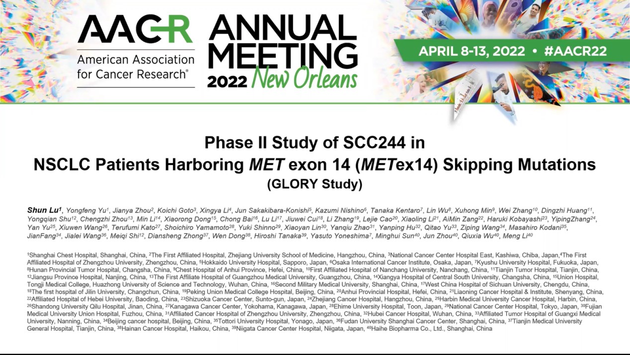 2022年度美国癌症研究学会学术年会大会(2022 AACR)于当地时间4月8—13日举行,带来国际肿瘤学领域治疗的最新前沿进展。上海海和药物研究开发股份有限公司具有全球自主知识产权的口服强效、高选择性的小分子MET抑制剂谷美替尼(SCC244)全球关键II期GLORY研究结果亮相本次AACR大会,并由本研究的全球主要研究者——上海市胸科医院陆舜教授进行口头报告。