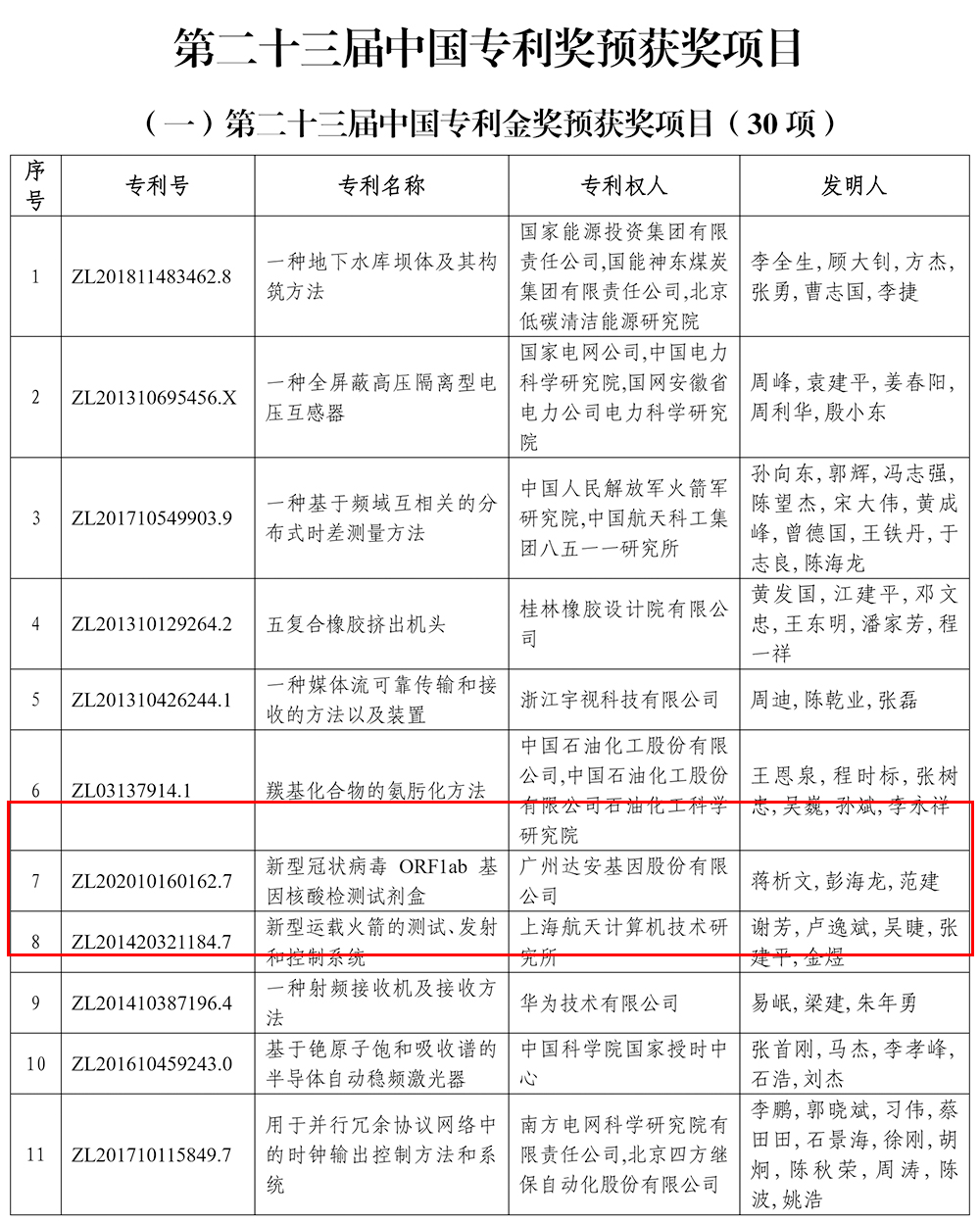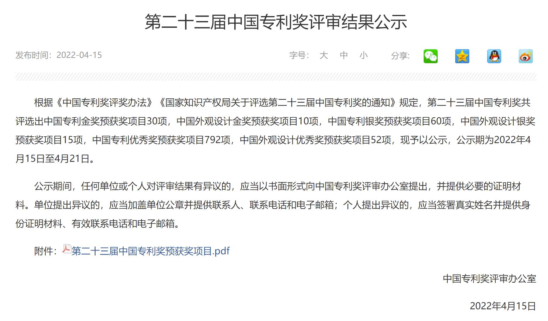 4月15日,中国专利奖评审办公室发布《第二十三届中国专利奖评审结果公示》,共评选出中国专利金奖预获奖项目30项,中国外观设计金奖预获奖项目10项,中国专利银奖预获奖项目60项,中国外观设计银奖预获奖项目15项,中国专利优秀奖预获奖项目792项,中国外观设计优秀奖预获奖项目52项。