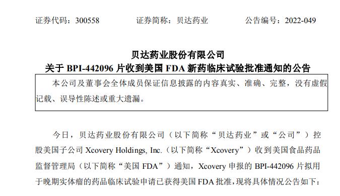 近日,贝达药业发布公告称,其控股美国子公司Xcovery Holdings, Inc.申报的BPI-442096片临床试验已获得美国FDA批准,拟用于晚期实体瘤。