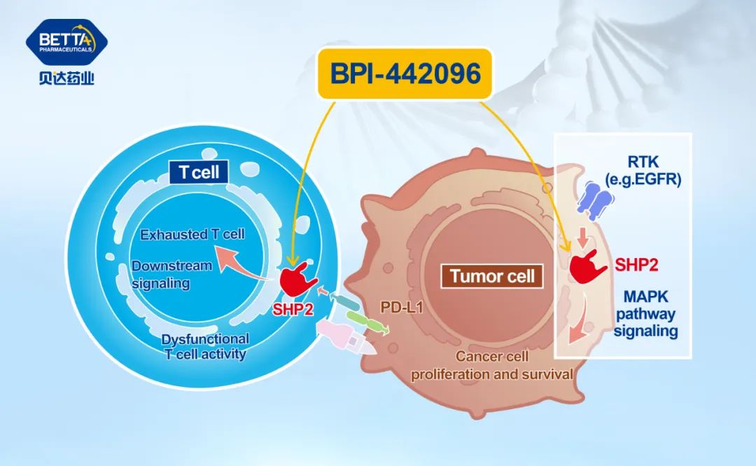 研究表明,在分子水平上,BPI-442096能够显着变构抑制SHP2磷酸酶活性,而对磷酸酶家族其他成员无抑制。在细胞水平上,BPI-442096对多种和SHP2传导的致癌信号相关的实体瘤细胞都表现出较强的增殖抑制活性,且能够显着抑制 相关细胞中ERK1/2的磷酸化。在肿瘤免疫方面,BPI-442096能够发挥较好的体外抑制PD-1/PD-L1结合的效能,为实体瘤患者带来更好的治疗效果。