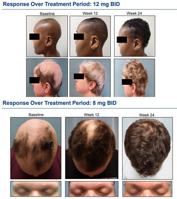 结果显示,在治疗24周时,与安慰剂组0.8%的患者相比,每日两次12mgCTP-543剂量组达到20分或以下(即达到80%或以上头皮毛发覆盖率)的患者比例为41.5%,每日两次8mgCTP-543剂量组为29.6%,CTP-543两个剂量组相对于安慰剂的治疗差异具有统计学意义(p<0.0001)。