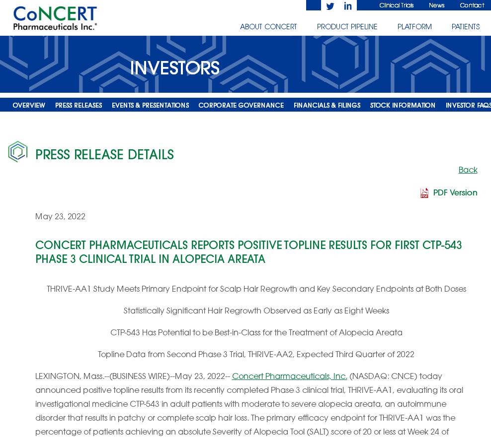 Concert Pharmaceuticals表示,目前正在期待THRIVE-AA2的数据结果,这是一个有500名患者参与的第二个3期临床试验,预计将于今年第三季度公布最终的数据,如果该试验也取得了积极的结果,公司将基于这两项数据在2023年上半年向FDA提交NDA申请。
