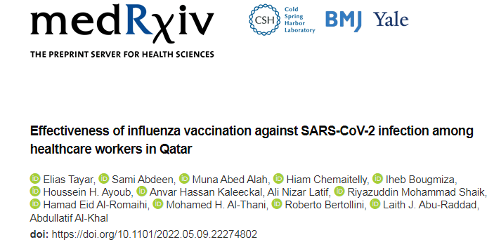 2022年5月9日,多哈威尔康奈尔医学中心研究团队在预印本平台medRxiv发表题为“Effectiveness of influenza vaccination against SARS-CoV-2 infection among healthcare workers in Qatar”的研究报告。