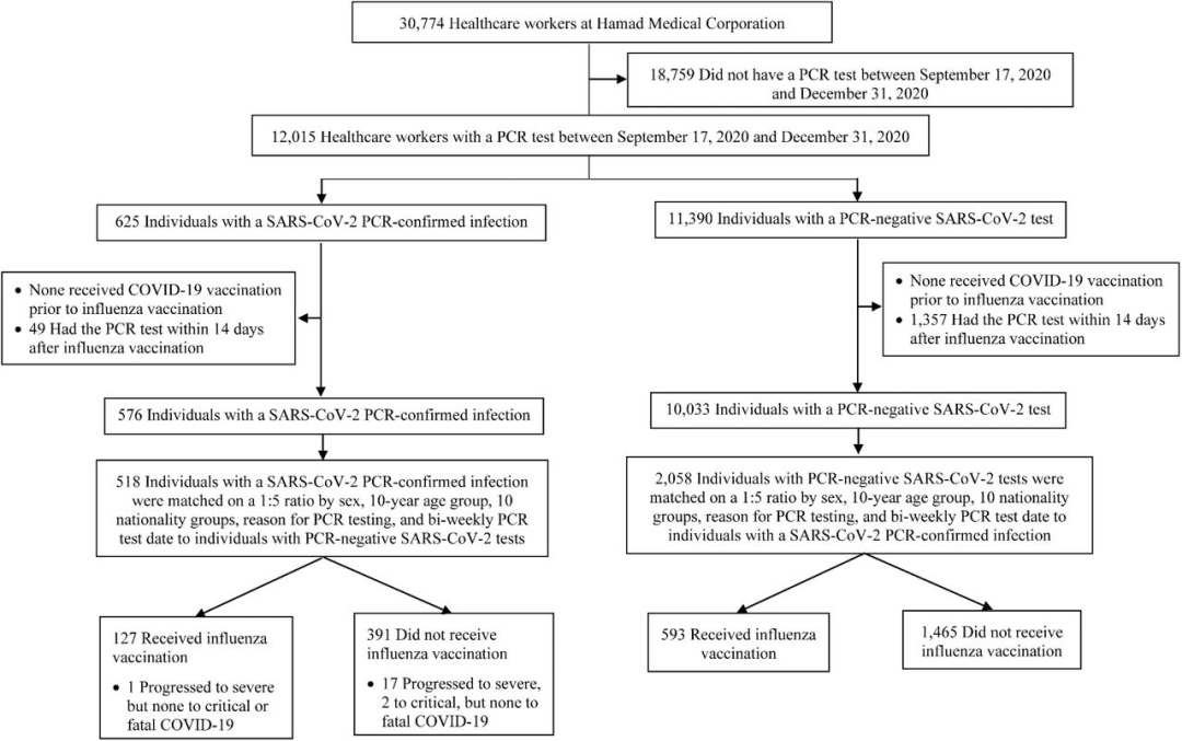 研究人员分析了2020年9月17日至2020年12月31日之间(新冠疫苗接种之前,流感疫苗接种之后的时期),卡塔尔30774名医务人员的健康记录。数据样本的中位年龄为36岁,对照组中位年龄为35岁,流感疫苗接种和PCR(Polymerase Chain Reaction)检测之间的中位持续时间为43天。研究人员认为,与一般人群相比,医务工作者在与健康有关的行为上的差异可能更小,从而可以减少(但可能不能消除)偏差。