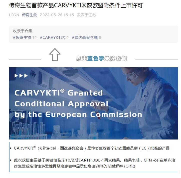 传奇生物关联公司金斯瑞同日也发布了上述消息的公告。