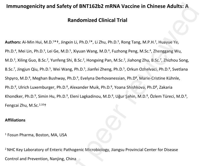 日前,医学学术期刊《柳叶刀》预印本平台(Preprints with The LANCET)发表了一篇名为《Immunogenicity and Safety of BNT162b2 mRNA Vaccine in Chinese Adults: A Randomized Clinical Trial》的研究论文,披露了mRNA新冠疫苗BNT162b2(复必泰)中国II期临床试验的主要研究数据,这也是首个披露中国人群二期临床数据的mRNA新冠疫苗。