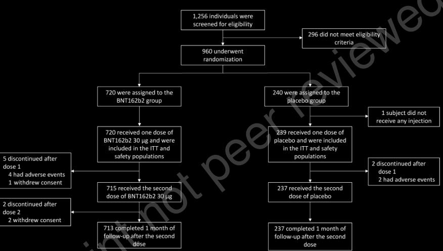 据了解,这项二期临床研究采用了随机、双盲、安慰剂对照的研究设计,由江苏省疾病预防控制中心主导执行,在2020年12月5日至2021年1月9日期间共招募了959例18-85岁受试者,受试者按年龄分为2组(18-55岁和56-85岁),并以3:1的比例随机接种2剂30μg(微克)剂量的mRNA新冠疫苗BNT162b2或安慰剂,其中BNT162b2组720例,安慰剂组239例,2剂间隔时间为21天。