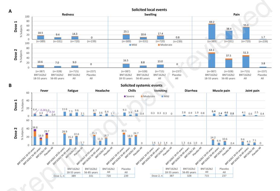 安全性方面,试验要求参与者记录每次注射后14天内任何出现的接种反应,包括发热、发力、头痛、发冷、呕吐、腹泻、肌肉疼痛、关节疼痛以及退热药物的使用情况等。结果显示,几乎所有在7天内发生的接种反应均为轻度或中度,且大部分接种反应是短暂的,其中最常见的局部事件是注射部位疼痛,最常见的全身性事件是发热,试验中没有报告心肌炎、心包炎或过敏反应的病例,疫苗接种后发生严重心脏不良事件的风险很小,未产生不良事件或严重不良事件。