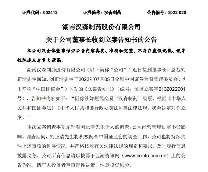 7月5日,湖南汉森制药股份有限公司发布公告称,因涉嫌短线交易公司股票,证监会对公司董事长、总裁刘正清立案。