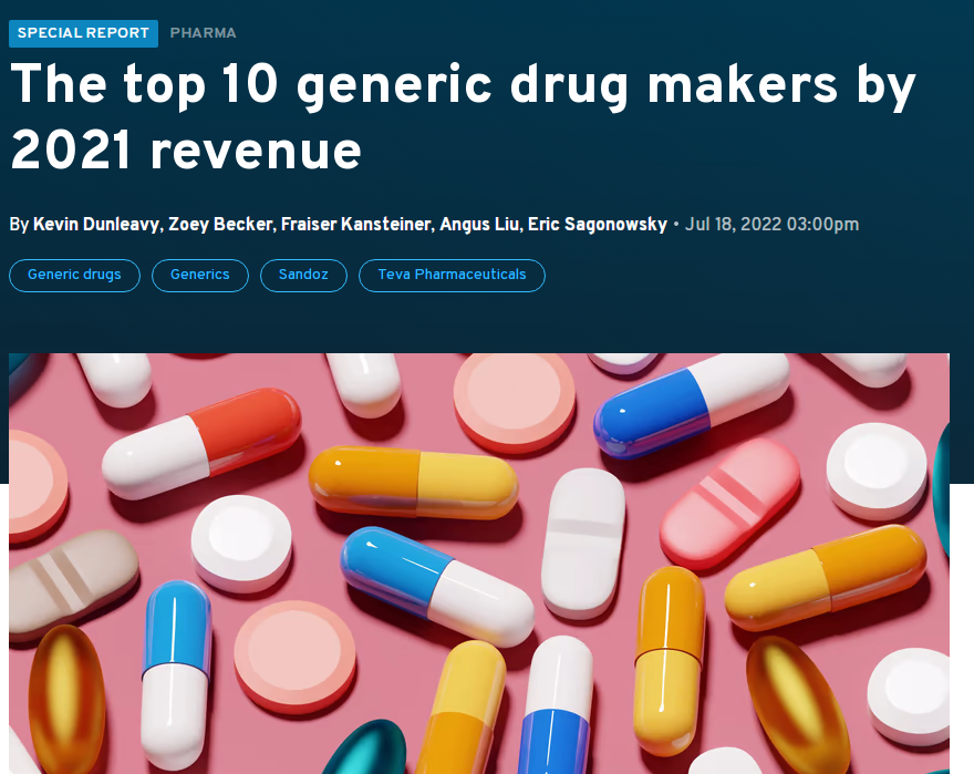近日,FiercePharma发布了2021年全球仿制药巨头TOP10榜单,该榜单主要以2021年仿制药的销售业绩为主。