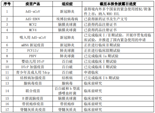 根据其半年报显示,康希诺新冠疫苗相关产品有3个,其中,Ad5-nCoV即重组新型冠状病毒疫苗(5型腺病毒载体)已获得境内外多个国家的紧急使用授权/附条件上市,并于今年5月备世卫组织可纳入全球紧急使用清单。
