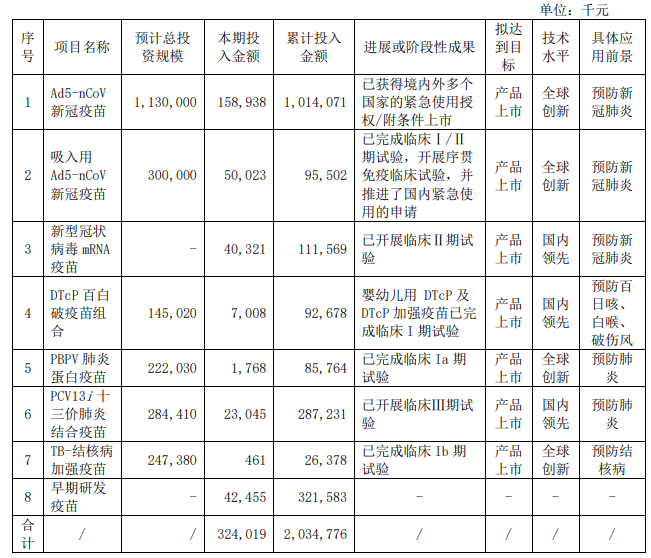 另值得一提的是,研发费用的增加也是康希诺由盈转亏的直接原因。财报显示,上半年康希诺研发费用达3.24亿元,公司表示“重组新型冠状病毒疫苗(5型腺病毒载体)于2021年实现商业化;且在研产品的研发进展、研发阶段不同所致。”