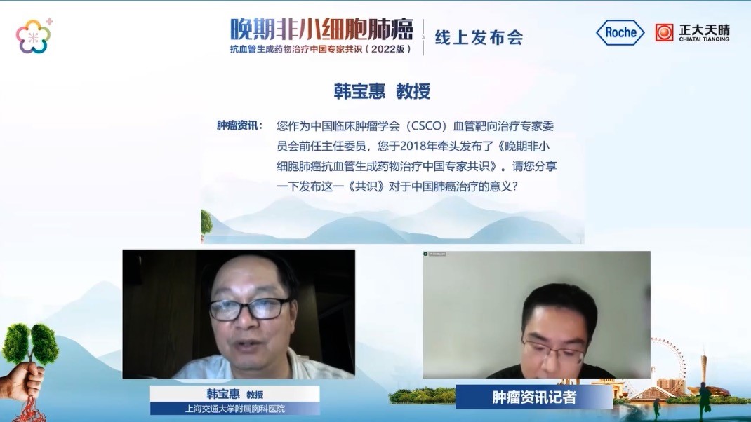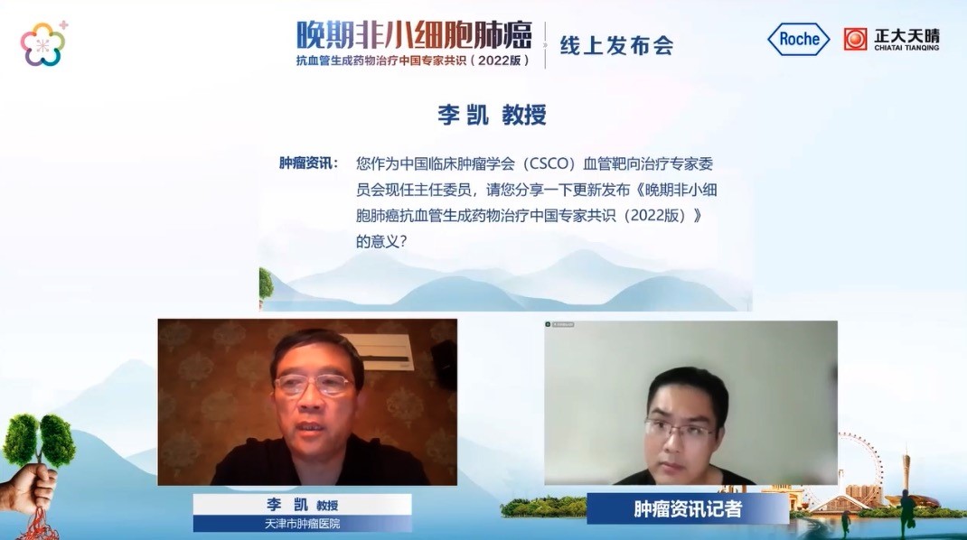 由中国临床肿瘤学会(CSCO)血管靶向治疗专家委员会及非小细胞肺癌委员会组织、并广泛征求了全国专家同道意见制定的《晚期非小细胞肺癌抗血管生成药物治疗中国专家共识(2022版)》(以下简称《共识》)于2022年9月27日在线发布会成功召开。《共识》汇总了晚期非小细胞肺癌(NSCLC)高质量的循证医学证据、以及经专家广泛认可的临床经验,提出了一系列切实可行的指导意见。随着近年来小分子靶向药物和免疫治疗应用经验的积累,《共识》增加了小分子靶向药物,如血管内皮生长因子(VEGF)抑制剂贝伐珠单抗bevacizumab、重组人血管内皮抑制素、小分子多靶点酪氨酸激酶抑制剂(TKI)安罗替尼anlotinib等在免疫治疗方面的新进展。