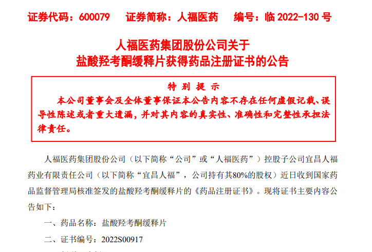 据了解,宜昌人福的盐酸羟考酮缓释片自主开发,系国内首次采用物理化学屏障技术实现口服阿片类药物防滥用效果的缓释制剂,可用于缓解持续的中度到重度疼痛。宜昌人福于2021年5月向国家药品监督管理局提交了盐酸羟考酮缓释片的注册申请并获得受理,截至目前该项目累计研发投入约为1800万元人民币。