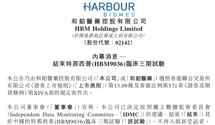 仅距商业化临门一脚,和铂医药一停一“卖”了两个药物。