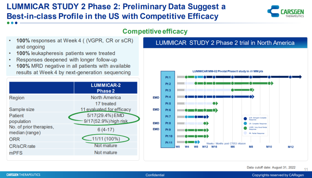 结果显示,在11名至少8周随访的可评估的患者中,4例患者伴随EMD,11例患者客观缓解率为100% (非常好的部分缓解、完全缓解或严格完全缓解),并在更长时间的随访观察到更深的缓解。由于所有的缓解都在进行中,中位无进展生存期、中位生存期和中位缓解持续时间尚未达到,并且完全缓解/严格完全缓解率尚未成熟。所有的在第四周有MRD结果的患者,通过二代测序MRD均为阴性。