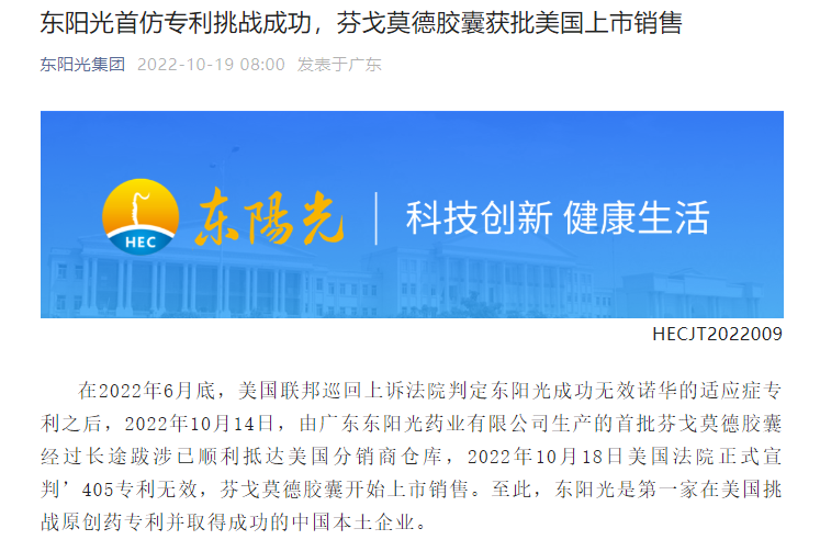 10月19日,东阳光集团在官方微信公众号公告,10月18日美国法院正式宣判’405专利无效,广东东阳光药业有限公司(以下简称:广东东阳光)首仿的多发性硬化症(MS)药物芬戈莫德胶囊正式被获批允许在美国上市销售。由此,东阳光及其芬戈莫德仿制药成为首家在美国挑战原创药专利并取得成功的中国本土企业和国产药品。