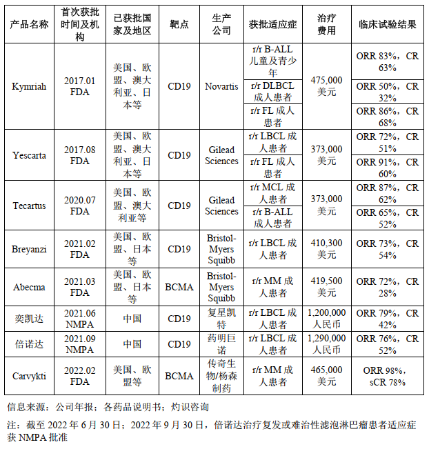 全球已获批上市CAR-T细胞治疗产品