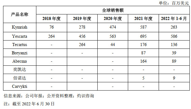 已获批上市CAR-T细胞治疗产品销售业绩