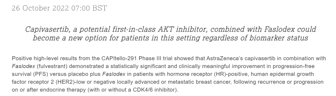 当地时间10月26日,阿斯利康宣布其Akt1/2/3抑制剂Capivasertib联用氟维司群治疗乳腺癌患者的III期CAPItello-291研究达到主要终点。