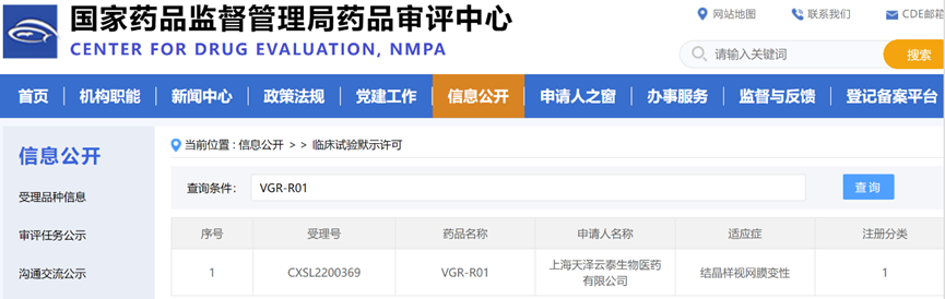 11月1日,位于张江科学城的上海天泽云泰生物医药有限公司(以下简称“天泽云泰”)宣布,其自主研发的VGR-R01注射剂临床试验(IND)申请获得国家药品监督管理局药品审评中心(CDE)默示许可。VGR-R01是针对CYP4V2基因突变导致的结晶样视网膜变性(Bietti crystalline dystrophy, BCD)患者的基因替代疗法药物,也是继今年7月VGB-R04注射液获批以来天泽云泰的第二款获得临床许可的基因治疗产品。
