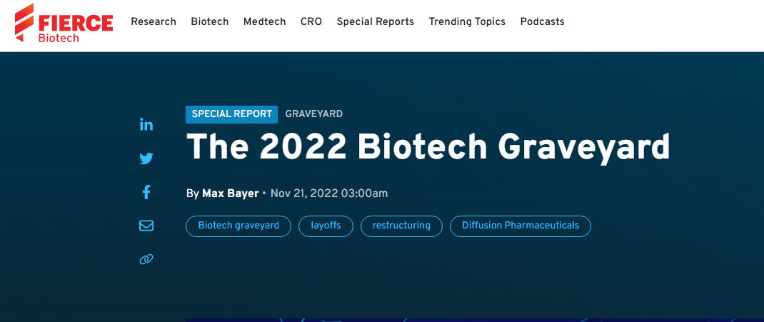 近日,Fierce Biotech发布了“2022年Biotech‘死亡’名单“,这是一份在金融动荡和临床失败的危险重压下诞生的名单,包括了7家公司,他们或已永久倒闭,或已有明确迹象表明即将进入破产倒闭阶段,曾为了”活下去“,他们并非没有努力过,裁员、收缩研发管线、出售资产、寻求融资……但当断臂求生依然无法实现自我拯救时,只能以倒闭收尾结束。导致这些企业失败背后的某些“经历”,或许能够为整个行业带来一些“警示”作用。
