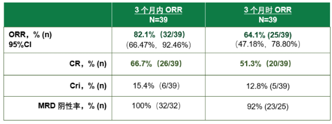 中位随访8.0个月,中位RFS和OS均未达到;3个月内达到CR/CRi患者中(N=32),预计12个月RFS率和OS率分别达64.4%和72.0%;3个月时达到CR/CRi患者中(N=25),预计12个月RFS率和OS率分别为80.0%和85.6%。