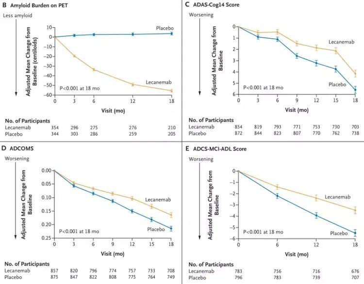 安全性方面,在该试验中,Lecanemab治疗组出现了6例死亡,安慰剂组出现了7例死亡;调查人员认为死亡与Lecanemab治疗及ARIA现象(淀粉样蛋白相关成像异常,可能是大脑水肿(ARIA-E)或微出血(ARIA-H)的迹象)均无关。lecanemab治疗组14.0%的患者发生了严重不良事件,安慰剂组11.3%的患者发生了严重不良事件。最常见的严重不良事件是输注相关反应、ARIA-E、房颤、晕厥及心绞痛。