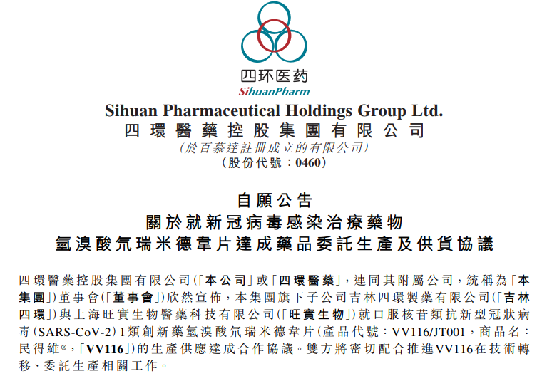 近日,四环医药发布公告表示,旗下子公司吉林四环与君实生物下属控股子公司旺实生物就口服核苷类抗新型冠状病毒1类创新药氢溴酸氘瑞米德韦片(产品代号:VV116,商品名:民得维)的生产供应达成合作。