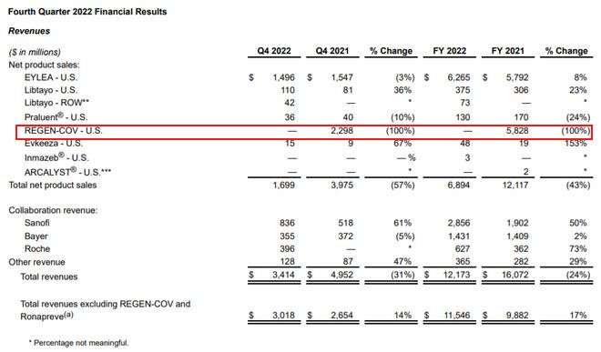 近日,再生元公布了2022年业绩,其全年总营收121.73亿美元,同比大幅下降24%,主要原因系其新冠中和抗体REGEN-COV的销售额出现急剧萎缩,如若不计入该产品6.27亿美元的销售业绩,则同比增长17%。