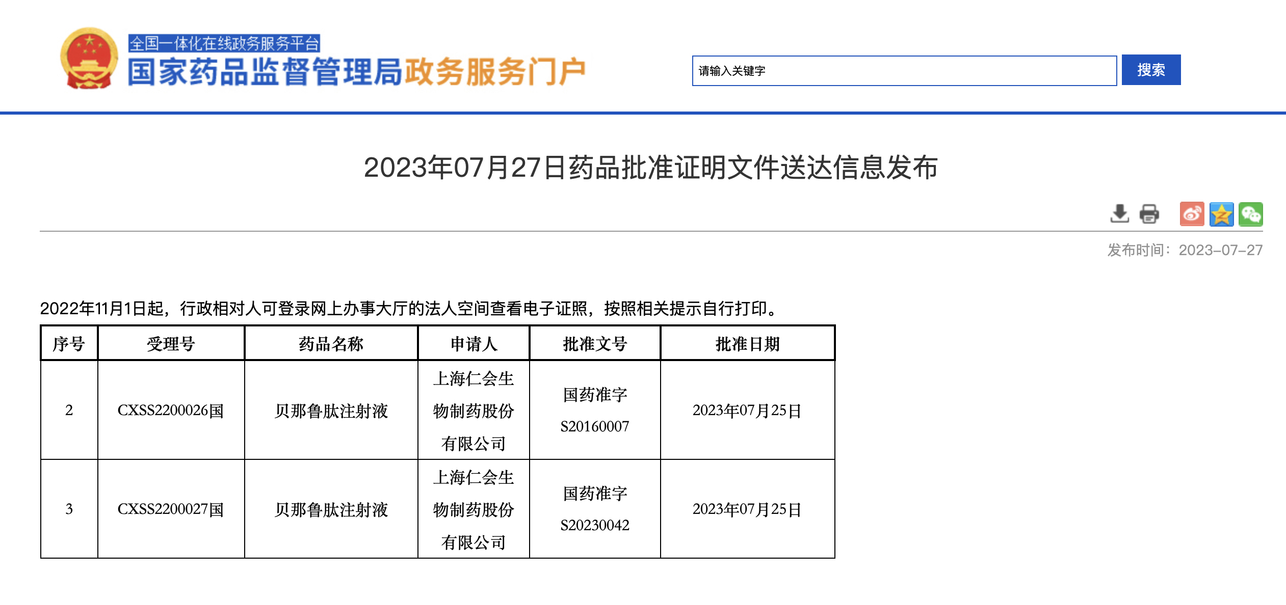 7月27日,国家药品监督管理局(NMPA)官网显示,位于张江科学城上海国际医学园区的仁会生物贝那鲁肽注射液的新适应症获得批准,用于成年人的体重管理,适用于:BMI≥28kg/m2者,或BMI≥24kg/m2伴随至少一种体重相关合并症(例如高血糖、高血压、血脂异常、脂肪肝、阻塞性睡眠呼吸暂停综合征等),规格为4.2mg(42000U)(2.1ml)/支。至此,贝那鲁肽成为国内首款获批减重适应症的原创新药,也是继诺和诺德研发的利拉鲁肽、司美格鲁肽之后,全球范围内第三款获批的GLP-1类减重新药。