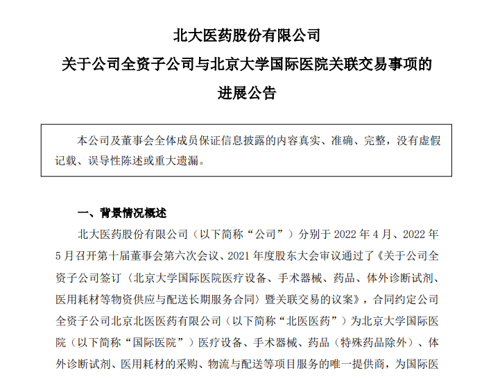 时间来到 2022 年 4月,北大医药宣布与北京大学国际医院再度签约,新的合作合同为期三年。根据合同约定,北大医药成为该医院医疗设备、手术器械、药品(特殊药品除外)、体外诊断试剂、医用耗材等项目的采购、物流及配送服务的唯一提供商。