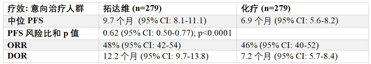 拓达维组的客观缓解率(ORR)为48%,化疗组为46%。拓达维组的中位缓解持续时间(DOR)明显更长。在确认达到完全或部分缓解的患者中,拓达维组的DOR为 12.2 个月,化疗组为 7.2 个月。