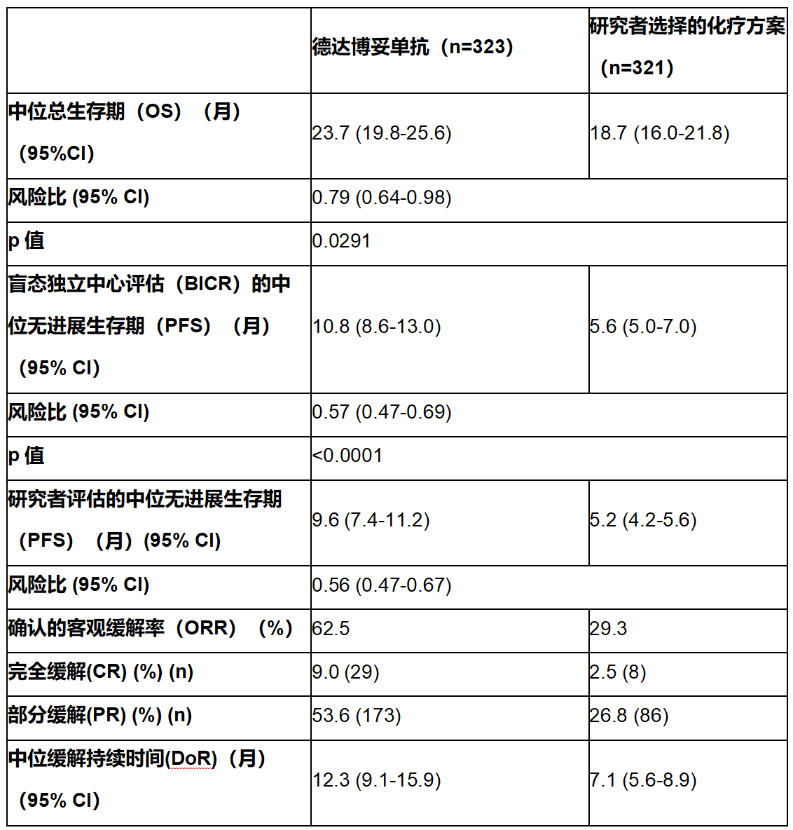 德达博妥单抗与化疗组相比,将中位总生存期(OS)延长5.0个月(风险比 [HR] 0.79;95%置信区间 [CI] 0.64–0.98;p=0.0291)。德达博妥单抗治疗组患者的中位OS为23.7个月,而化疗组为18.7个月。