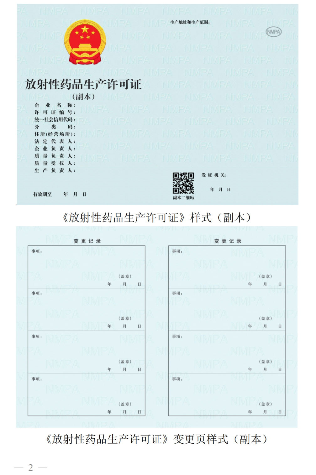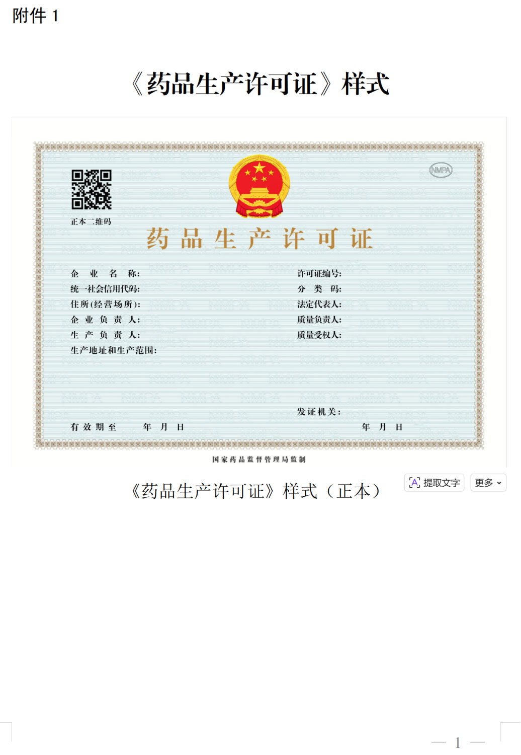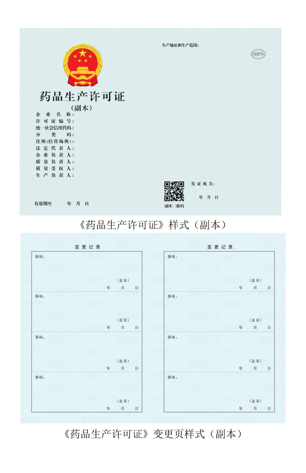 一、国家药监局制定新版《药品生产许可证》《放射性药品生产许可证》样式(详见附件1、2)。新版许可证正、副本登载不同的二维码,并分别标注“正本二维码”和“副本二维码”字样。正本二维码展示企业基本信息,副本二维码除展示企业基本信息外,同时封装企业车间和生产线、委托/受托生产、变更记录等信息。