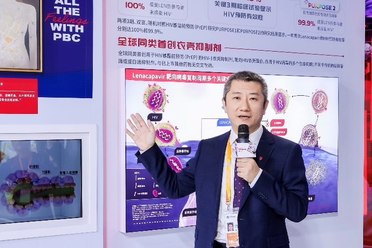 吉利德中国医学事务部负责人肖华为参展观众介绍重磅展品