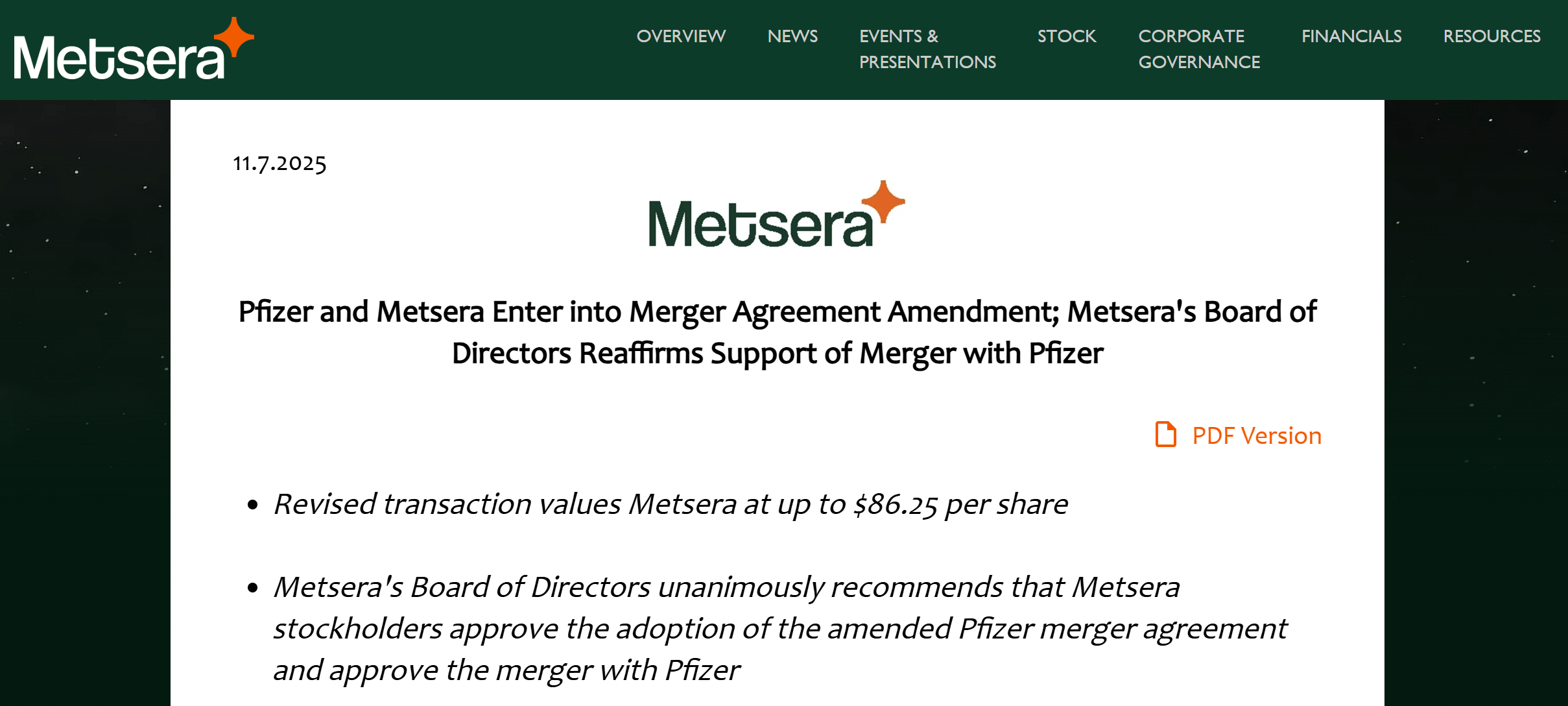 根据新闻稿,Metsera宣布,已与辉瑞达成修订版合并协议,辉瑞将以每股最高86.25美元收购Metsera,其中包括每股65.60美元的初始现金支付,以及达到特定里程碑时最高每股20.65美元的额外付款。双方预计将在11月13日股东大会后尽快完成交易。