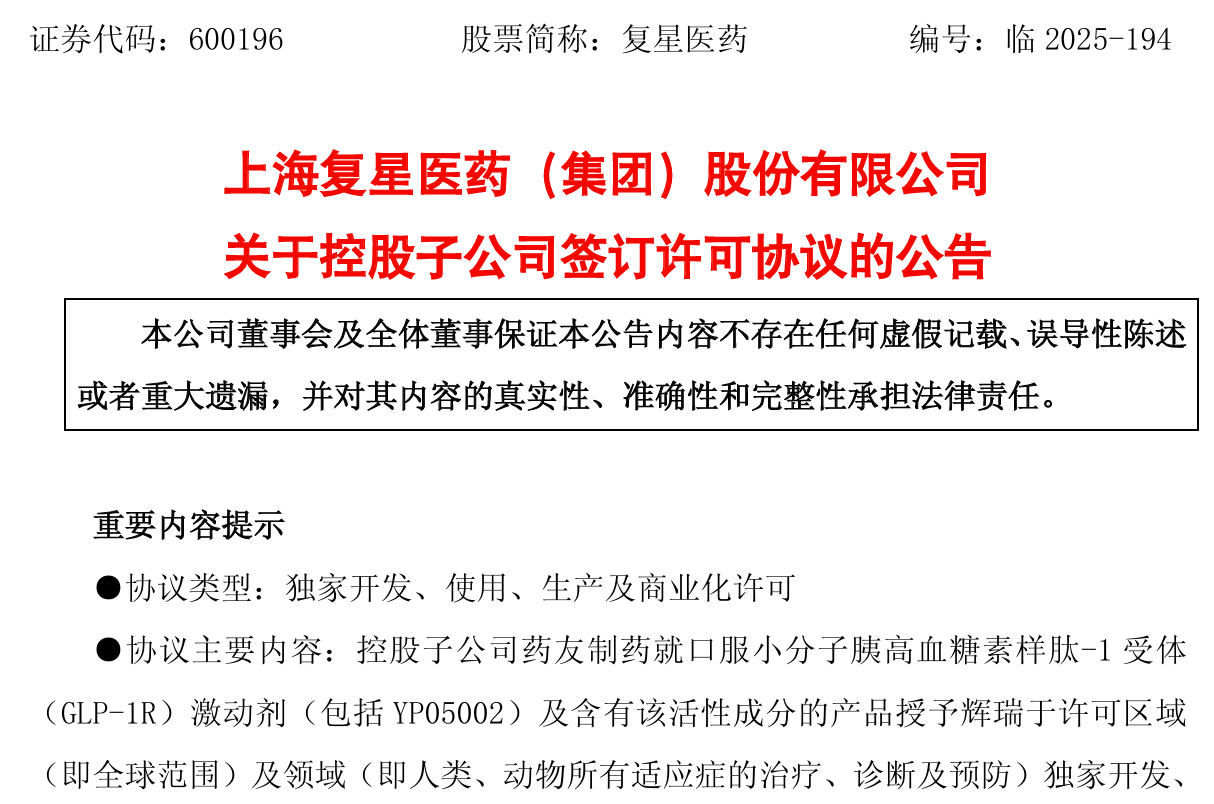12月9日晚间,复星医药发布公告称,公司控股子公司药友制药、复星医药产业与辉瑞共同签订《许可协议》,(其中主要包括)由药友制药就口服小分子胰高血糖素样肽-1受体(GLP-1R)激动剂(包括YP05002)及含有该活性成分的产品授予辉瑞于许可区域(即全球范围)及领域(人类、动物所有适应症的治疗、诊断及预防)独家开发、使用、生产及商业化权利。