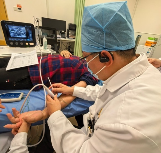 图注:上海市养志康复医院靳令经教授为首例受试者进行注射