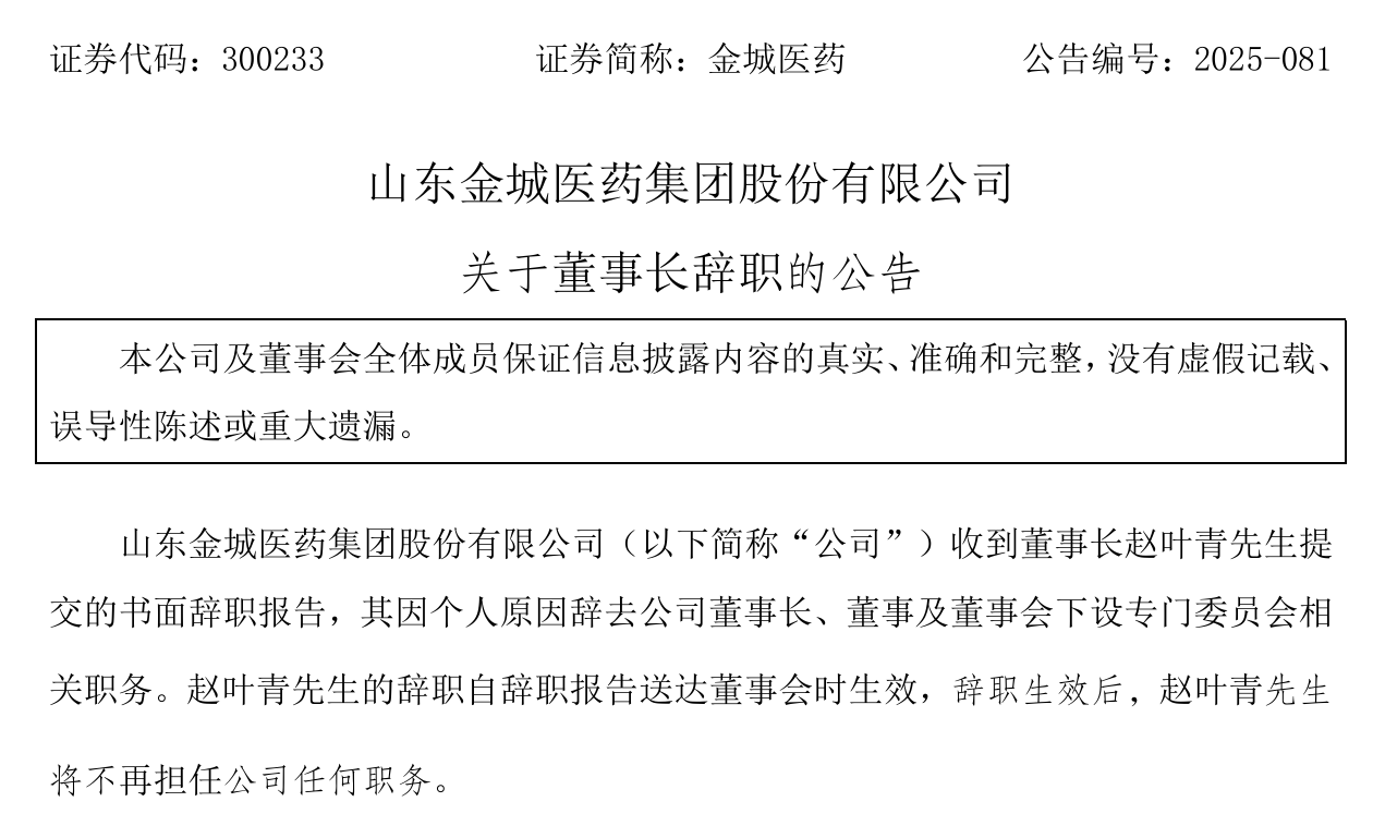 2025 年 12 月 12 日,位于山东淄博的创业板上市企业金城医药发布公告称,公司董事长赵叶青因个人原因辞去董事长、董事及董事会下设专门委员会相关职务,辞职后将不再担任公司任何职务。而这一 “个人原因” 的背后,是其因参与操纵公司股票收到中国证监会《行政处罚决定书》的重磅处罚。金城医药同日发布公告显示,2025 年12 月10日,公司收到实际控制人赵叶青先生的通知,其收到中国证监会《行政处罚决定书》。