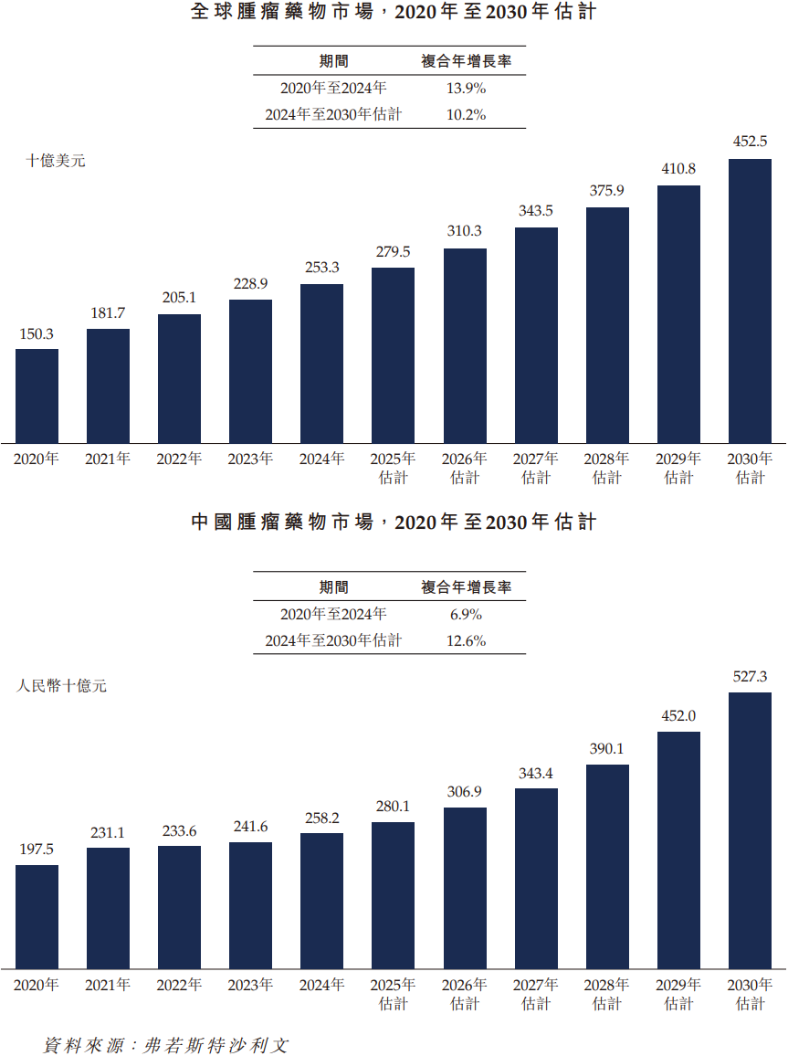 根据GLOBOCAN的数据,2022年全球癌症新发病例约2,000万,死亡病例约970万,预测到2030年全球癌症新发病例将接近2,400万,死亡病例将接近1,200万。从市场规模来看,全球肿瘤药物市场已从2020年的1,503亿美元增长到2024年的2,533亿美元,复合年增长率达13.9%,且预计还将以10.2%的复合年增长率增长至2030年的4,525亿美元,癌症诊疗药物市场空间巨大。