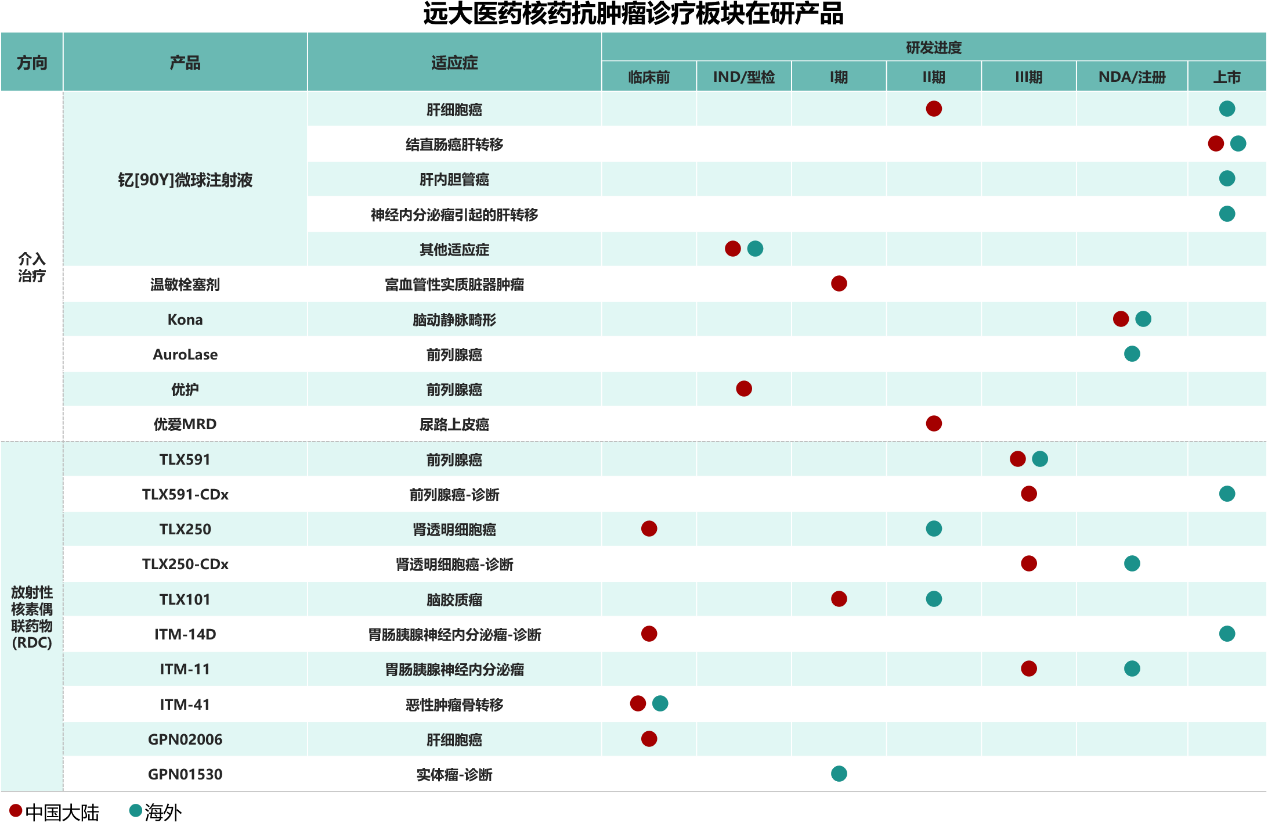 产品管线方面,远大医药是进入中国III期临床研究中诊断和治疗类RDC创新药总计储备最多的企业,也是全球范围内在核药抗肿瘤领域拥有最丰富产品管线和诊疗一体化布局的创新药企之一。目前,公司在研发注册阶段已储备16款创新产品,涵盖68Ga、177Lu、131I、90Y、89Zr在内的5种放射性核素,覆盖了肝癌、前列腺癌、脑癌等在内的7个癌种;早期研发阶段以RDC药物为主,产品储备10余款。在产品种类方面,涵盖诊断和治疗两类核素药物,为患者提供多适应症治疗选择、多手段且诊疗一体化的全球领先的抗肿瘤方案。