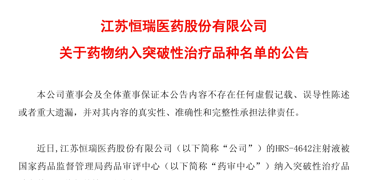 资讯 恒瑞医药HRS-4642注射液被纳入突破性治疗品种名单