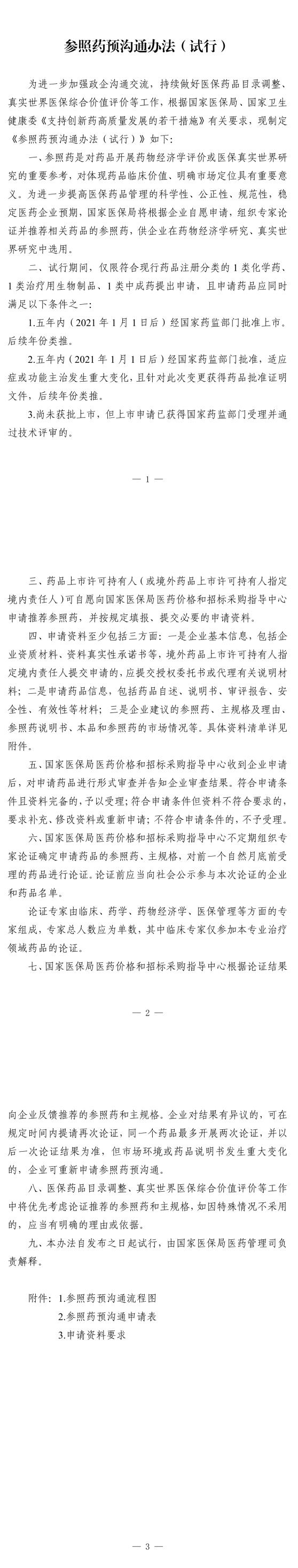 为进一步加强政企沟通交流,持续做好医保药品目录调整、真实世界医保综合价值评价等工作,根据国家医疗保障局、国家卫生健康委《支持创新药高质量发展的若干措施》(医保发〔2025〕16号)有关要求,国家医疗保障局研究制定了《参照药预沟通办法(试行)》,现予发布。自发布之日起施行。